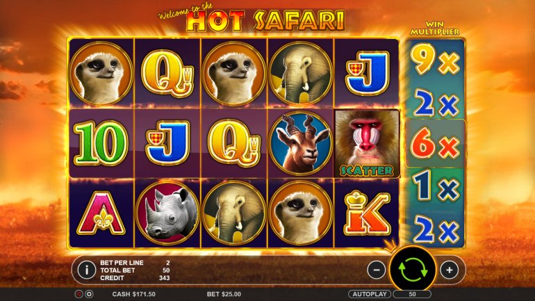In addition, the sixth reel contains a special symbol. It triggers the bonus round called Super Wild. When you play it, wild pictures appear randomly on all reels. Details can be found in the review of the Hot Safari slot machine.
