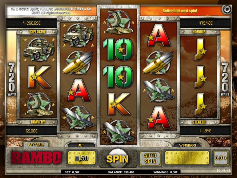 Not only is one video pokie devoted to the action movie about the hard life of a Vietnam War veteran, John Rambo, but in our review, we include only the model from iSoftBet, as it seems to us the most worthy of attention. This model is interesting due to its unusual arrangement of pictures on the screen, numerous combinations in the majority of spins, four progressive jackpots, and numerous other gameplay features.