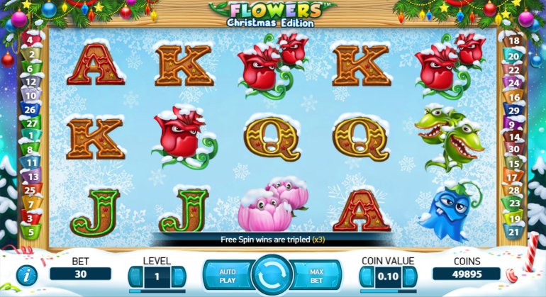 Flowers: Christmas Edition draws the attention of gamers due to the presence of double images, which allows making a combination that contains up to ten elements. In addition, free spins are available in this game.