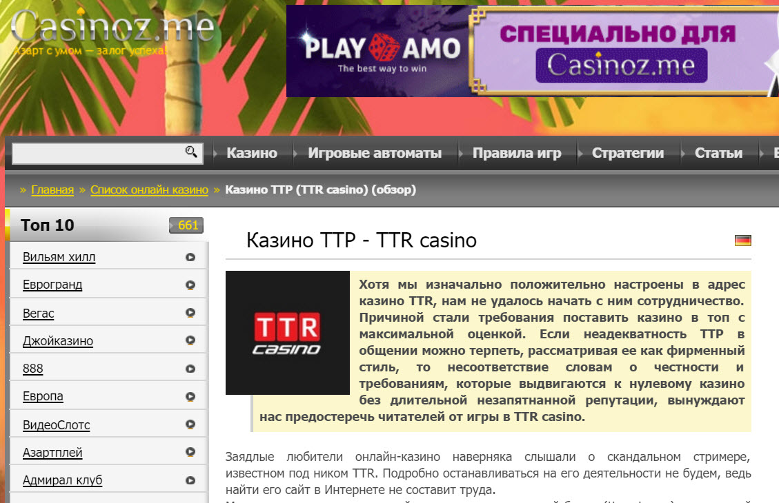 Initially, it was not even present on the homepage in the section Top Casinos. However, then TTR Casino moved to 4th place.