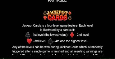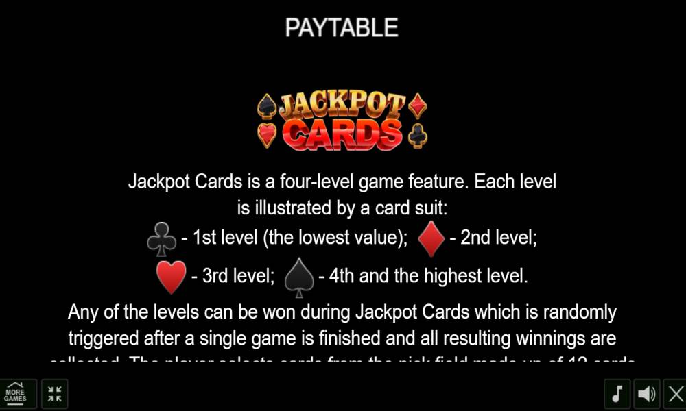 At random times during the base game, the Jackpot Cards round can be triggered. The user will be able to win one of four jackpots. They are not fixed, but change all the time. Each prize corresponds to one of the four suits of cards. How to get a prize? Turn over the cards one by one (12 cards face up) until you find 3 identical ones. The amount of the prize is easy to find out - it is displayed on the screen next to the reels.