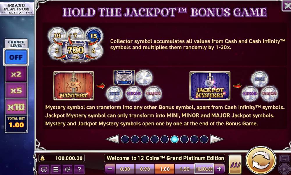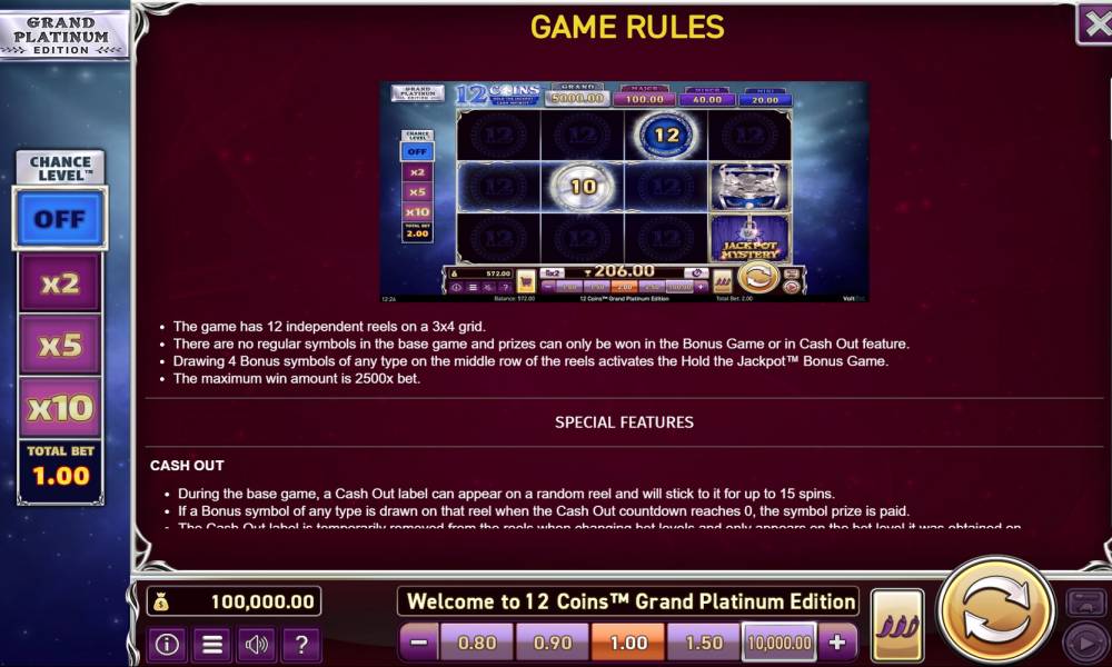 Wazdan's 12 Coins Grand Platinum Edition pokie is a 12 active line game with no paylines. The top online slot continues the Coins series and includes popular mechanics such as Hold the Jackpot as well as unique features: Cash Out, Cash Infinity and Chance Level. I tested the online slot and determined that it stands out for its impressive graphics and thoughtful gameplay. This is a great option for those looking for a non-boring game. The high volatility means that wins may not be frequent, but they can be very large. If you're willing to take the risk, it's worth a try.