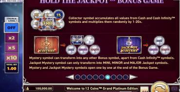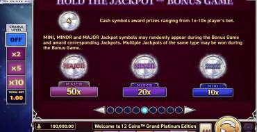 12 Coins Grand Platinum Edition has 12 active lines and 4 reels. The main feature of the pokie is the possibility of winning a large jackpot - up to 2500x of the player's bet. Winning combinations are formed due to the unique features and mechanics of the game. Players can activate bonus features such as Hold the Jackpot, which significantly increase the chances of a big win. Coin symbols play a key role in generating bonus rounds. Wager size is available from 0.20 to 10,000 coins.