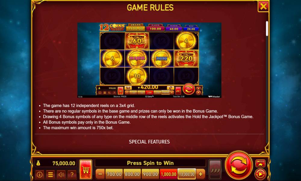 The demo is a great tool for players. The demo of Wazdan's 12 Coins slot allows players to familiarize themselves with the slot's functionality, familiarize themselves with the payout table and rules. Demo version is a great way to familiarize yourself with the online slot without deposit and registration.