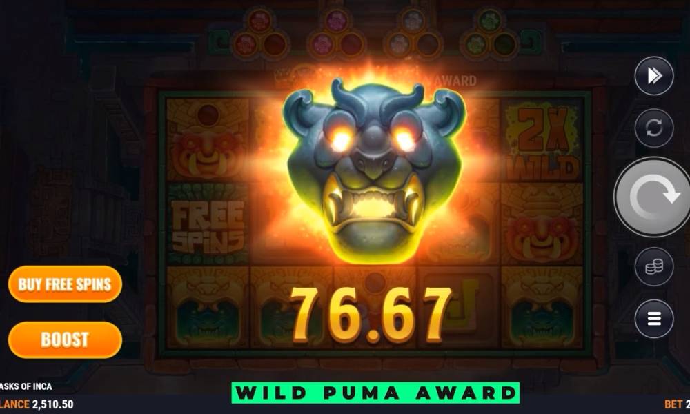 Boost. This feature can be turned on and off in the regular game at any bet. If you enable Boost, you will be charged +50% of the bet amount for each spin, but the chance of Free spins, Wild symbols and Inca Battle Token will increase.