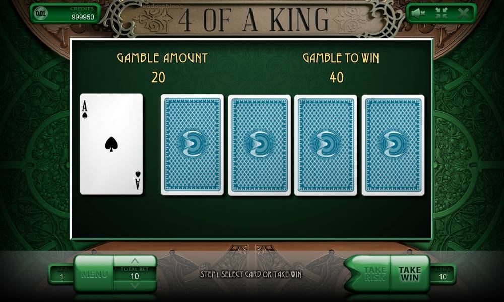 «4 of a King» is a slot machine for online casinos, which has five reels, fifteen symbols at the main screen and ten pay lines, any number of which can be activated on the customer’s choice. Bets per each of the lines are always equal. The betting range lets the gamblers stake up to one hundred coins in value of 0.01, 0.10, 0.50, 1, 2 or 5 credits per each of the lines. This way, the total bet per round varies from one cent to five thousands credits in the gaming currency. «4 of a King» offers basic symbols, which form combinations by the general rules, but also icons with advanced functions, the gambling feature and extra features, described below. The standard elements form winning combinations at the active lines. Three and more same symbols have to be situated next to each other, starting from the first left reel. As usually, only the longest combination at each of the lines is paid. An amount of the win is calculated by multiplying the bet per line by the special index provided by the rules for each of the possible combinations. It can be from x5 to x1000 here. In case of several combinations formed a different lines, all charged credits are summarized. On the customer’s choice, it is possible to stake the win in the gambling feature. In this case five cards appear at the special screen and only one of them is laying face-up. It is necessary to reveal any of four rest randomly. If it hits the dealer’s card, your payoff is doubled up. However if it is lower, all money go to the casino. Tie game is announced in case of equal cards. It is possible to quit this round at any moment. Unfortunately, we have no information about payback index of «4 of a King». All exceptions from the rules are discussed below.