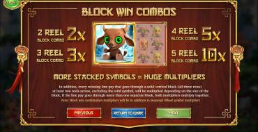We would like to start discussion of prize features from the wheel which can be found in the left bottom corner of the screen. It is divided into twelve sectors and four seasons. An animal of the year is imaged in each of them. Once in thirty spins the wheel moves to the following sector. An animal imaged there turns golden and provides the player with extra opportunities in form of prize payoffs. It also affects the characters situated next to it. Please read about other features of this wheel in the rules. «4 Seasons» is also provided with the special system of wins - Block Win Combo. When combinations formed of same symbols at the neighbor reels fill whole blocks of cells, they are charged with additional payoffs.