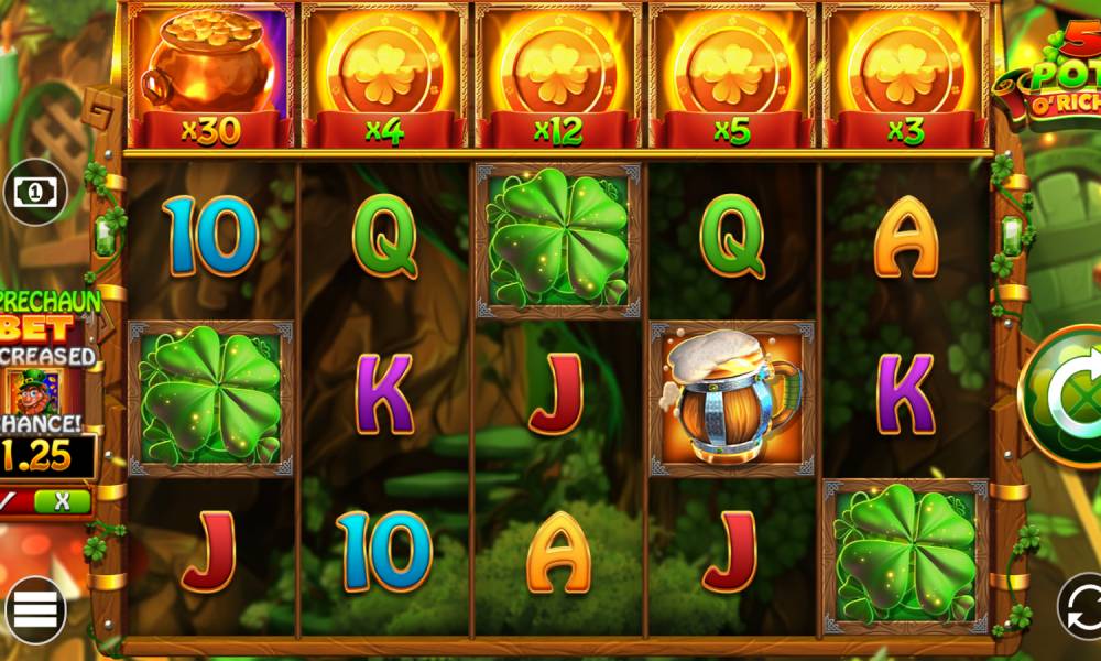 The design of 5 Pots O' Riches is classic Irish style with bright green hues, leprechauns, pots of gold and rainbows. The graphics are juicy and pleasant, it creates an atmosphere of luck and fun. The musical accompaniment corresponds to the theme - the game sounds light Irish motifs. Animations are smooth, and sound effects, such as coins ringing and fanfare when winning, make the gameplay even more exciting.