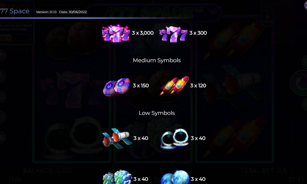 In the slot 777 Space from the Spinomenal provider will not be able to find exciting bonus mechanics. It is not realized neither special symbols, nor free spins. But it will be a good opportunity to distract and relax after a hectic workday.