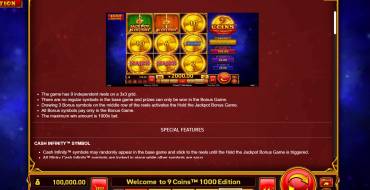 According to our editorial team, 9 Coins: 1000 Edition is a great pokie for those who like exciting bonus levels and a simple gameplay. Casinoz experts think that the Hold the Jackpot feature makes the game dynamic and exciting. We also liked the ability to adjust the volatility, which allows players to choose between frequent small wins or less frequent but larger payouts.
