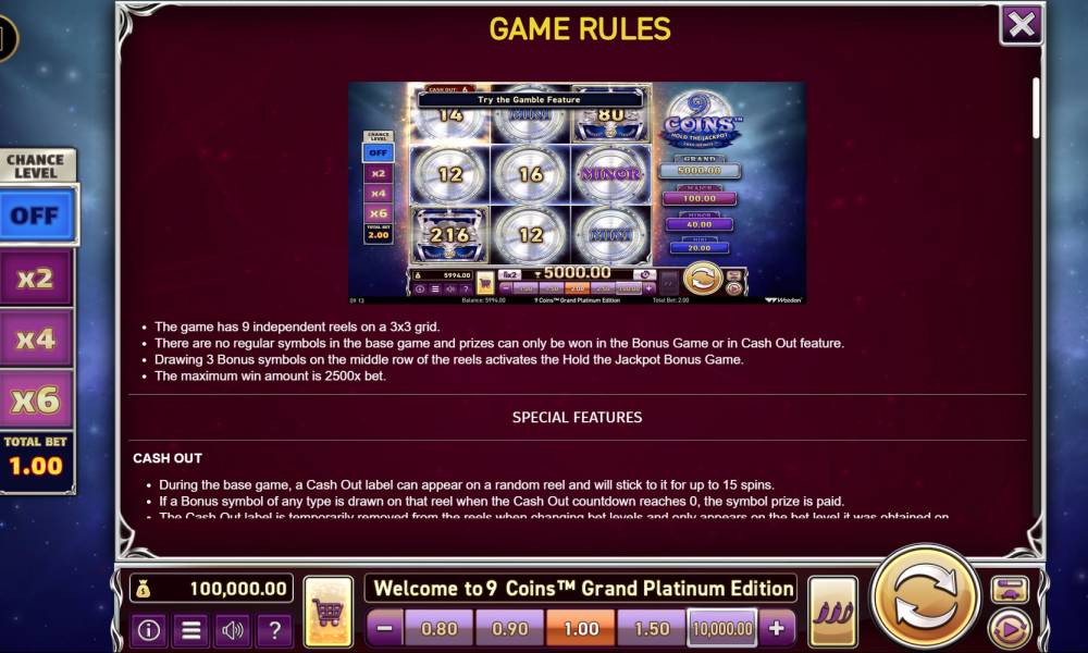 So, we recommend trying 9 Coins Grand Platinum Edition video pokie, especially if you like jackpot bonus games. Unique features like Cash Infinity and Chance Level make the gameplay more interesting. We also liked the ability to customize volatility, and it's also up to you. You can start your first game with the demo mode.