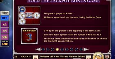 Hold the Jackpot, this is the main bonus game, is activated when 3 bonus symbols fall on the middle row. All bonus symbols become sticky and the player gets 3 respins.