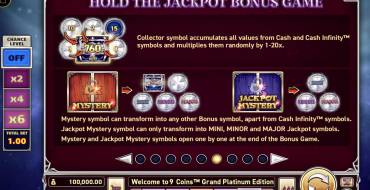 There are no classic active lines in the pokie - winning combinations are formed when three bonus symbols fall on the middle row. The playing field consists of 3 reels and 3 rows. The base game does not offer standard wins, but Cash Infinity symbols and the Cash Out feature add prizes. The stakes in the game vary and the player can choose the bet size, as well as activate the Chance Level feature to increase the chances of a bonus. The betting variation ranges from 0.2 coins per spin, up to 10,000 coins per spin. Symbols include the usual bonus symbols with prizes ranging from 1x to 15x the bet, as well as mini, minor and major jackpots. Bonuses are activated by the Hold the Jackpot feature, which can award a Grand Jackpot of 2500x the bet.