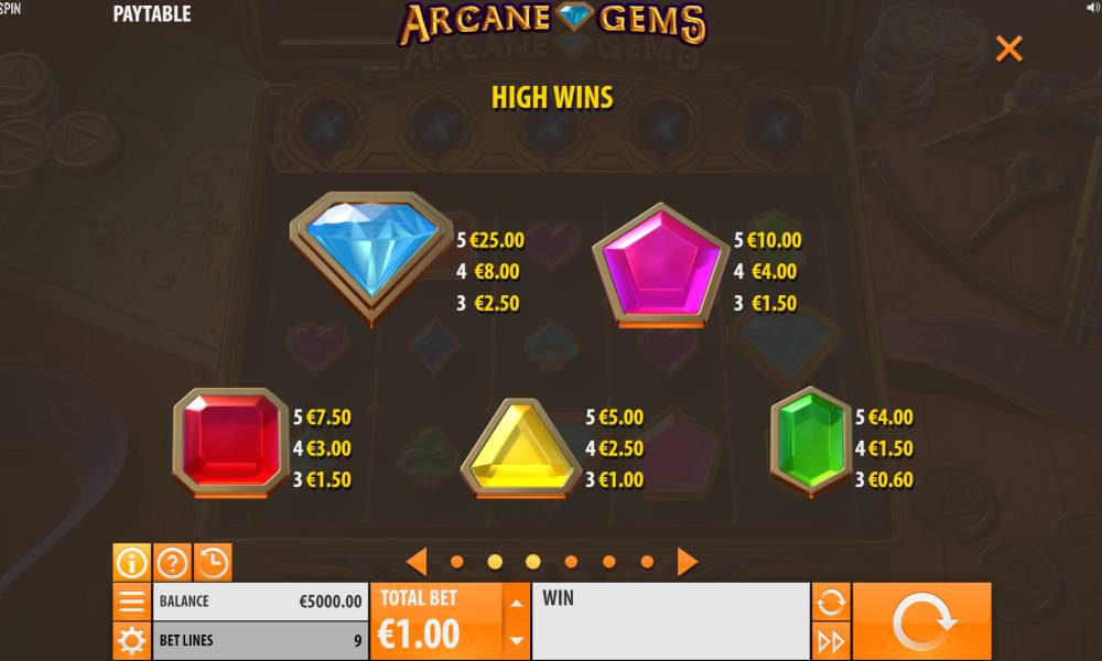 The Arcane Gems slot machine from the Quickspin provider has a standard playing field, consisting of 5 reels with 3 symbols. Payouts are made on 9 pay lines.