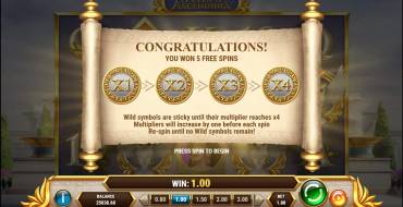 In the online pokie Athena Ascending the field has classic 5x3 dimensions, with no expansions. In the gameplay takes part 3 special and 10 row symbols. Combinations are made from left to right, to win you need 3 identical symbols. The rate is selected from a range of 0.05 to 100 c.u. with a maximum increase in x10000. During the regular game mode is possible to fall multipliers, the action of bonuses increases during freespins, as they have a countdown.
