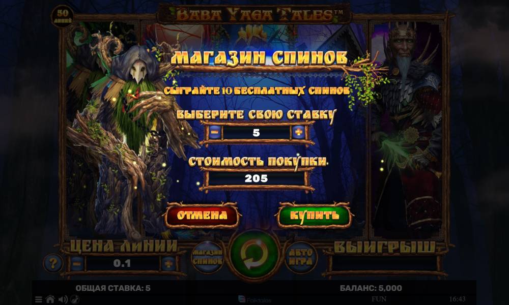Baba Yaga Tales will please the player with maximum winnings of x1000 from his initial bet. The game is played on a standard 5x3 field, the number of lines is fixed at 50. The combinations are counted from left to right. Bonuses can be purchased in the corresponding menu, located to the left of the "Start" button. Free spins are a separate game with several levels, in each of which the Wild symbol has its own mechanics. The maximum bet value is 50 cu.u. and the minimum 0.2.