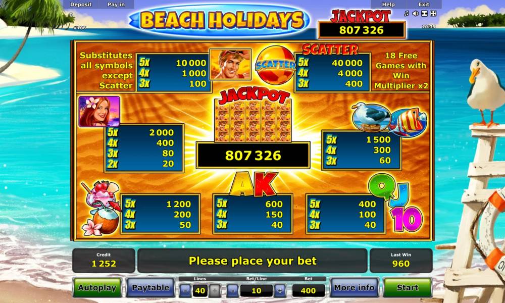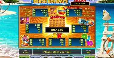 Do you like chilling at tropical coast? If so, you gonna like «Beach Holidays» video slot, developed by Novomatic. It brings you to exotic island, where you will find high payoffs and pleasant surprises.