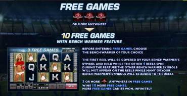 Bench Warmer Feature. Starts when 3 or more Scatter symbols appear. Launches 10 free spins and allows you to choose one of the girls, whose image will expand onto the first reel. Further spins create a variety of winning combinations, including new spins of the Bench Warmer Feature, which can continue without restrictions.