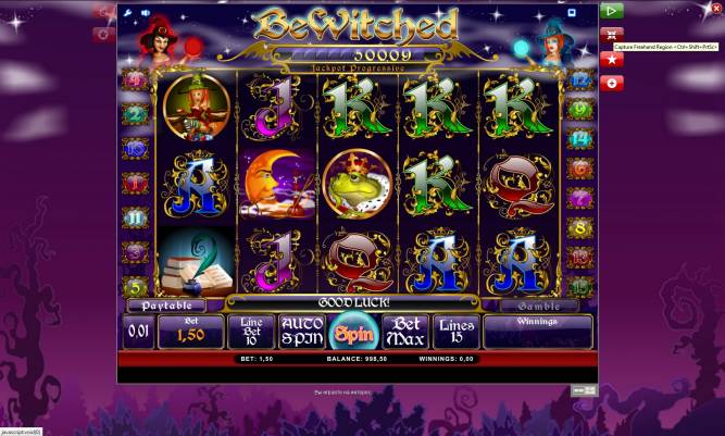 Bewitched is a five reeled online video slot with fifteen pay lines and three rows of symbols at the screen. The players have an opportunity to play this slot machine using from one to fifteen active lines. Herewith, it is possible to stale up to ten coins of value in range from one cent to one dollar. As you can calculate, the maximal acceptable bet per spin is one hundred fifty dollars.