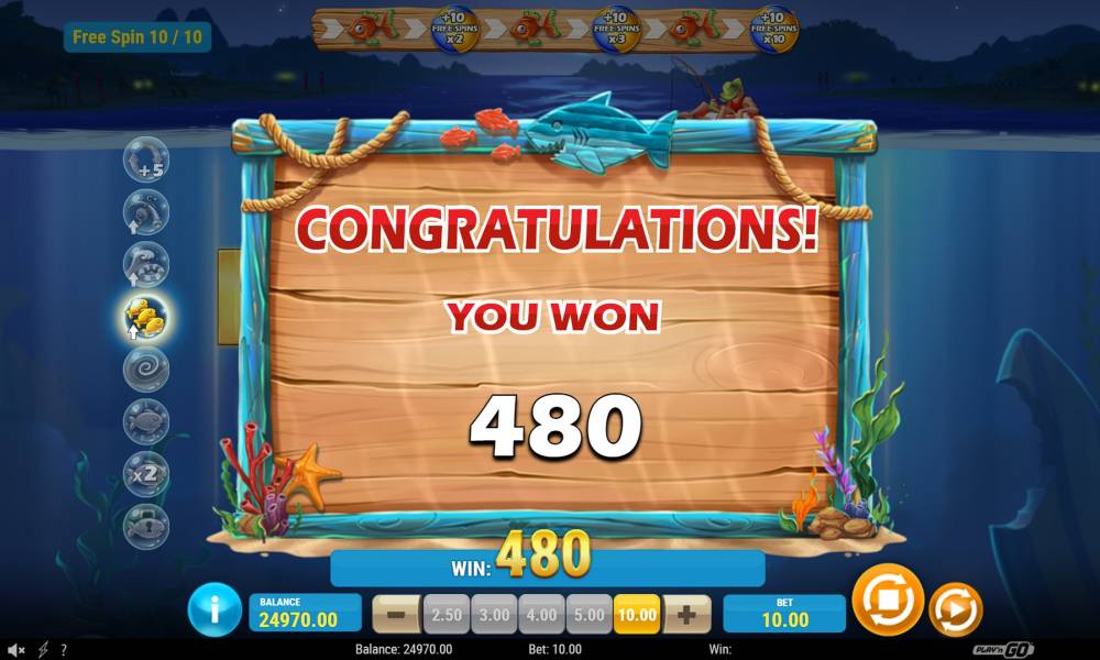 The interface is typical for most games from Play'n Go. It is concise, convenient and maximally functional. The main playing field is located in the center of the screen. Above it, on the surface of the water floats in his inflatable circle fisherman, activating bonus opportunities. Under the reels is a control panel, which has a help menu (button "i"), the ability to select the rate using "+" with "-" or ready-made options and buttons "Spin" with "AutoStart".