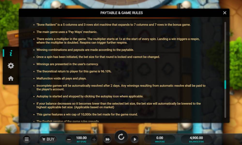 Casinoz experts' opinion after a trial session: the pokie is beautiful, pays well, the bonus round with 4 unusual features is interesting. But the normal spins are too monotonous, as the slot doesn't even have Wild. Therefore, you can try the Bone Raiders, but for a long time it is unlikely to fascinate.