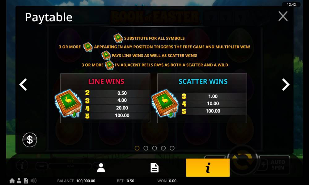 The Book of Easter slot machine from the Swintt provider consists of a standard 5x3 playing field. Payouts are made on 243 lines.