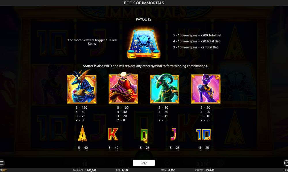 The Book of Immortals is provided with basic symbols, a Wild/Scatter, a Scarab Swap bonus and free spins with advanced functions of some symbols.