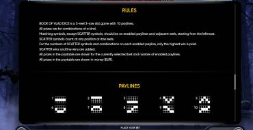 The Book of Vlad Dice video pokie offers a game on 5 reels in 3 rows with 10 paylines, and the gamer has the right to choose the number of lines. The value of the total bet is between 0.10-45 euros. Winning combinations are made up of 5 identical symbols, located in a certain way in a row on neighboring reels when counting from the left edge to the right. High and medium paying symbols give a multiplier to the bet when 2 or more fall out. Low-paying symbols and Scatter+Wild pay out starting with 3 pieces. The maximum multiplier of x500 to the bet promises the appearance on the field of 5 symbols Count Vlad Dracula.