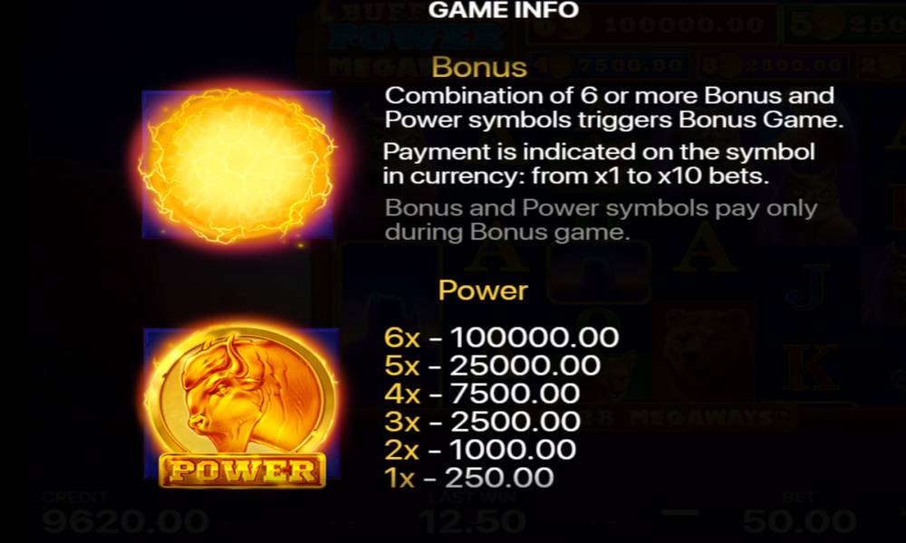 The Buffalo Power Megaways pokie machine from the provider Playson has a classic field consisting of 6 reels, the number of symbols in which is determined by the mechanics of the Megaways. Payouts are made on 46656 combinations.