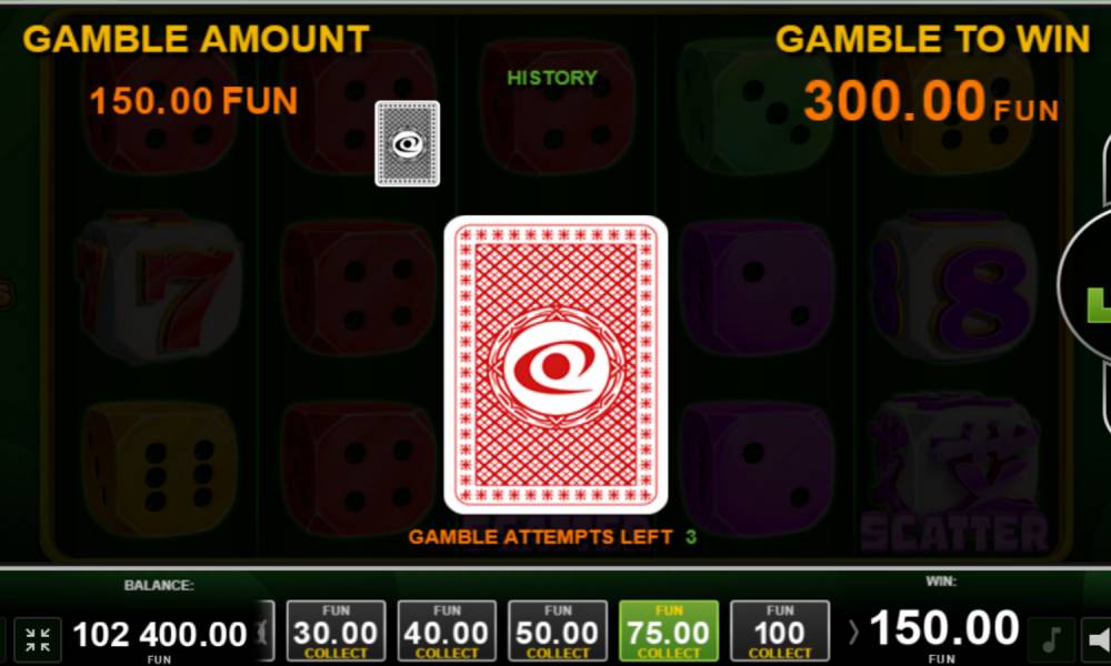 The Gamble round can be triggered if the spin prize is x35 of the bet or less. It can also be increased only up to this size and no more than five times. The point of the game is to guess the color of the card - red or black. The correct answer brings doubling the winnings and gives the opportunity to continue, wrong - its loss and the end of the round. At any time after winning, the user can take the money and not risk it further.
