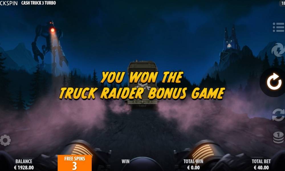 Truck Raider. It starts when 3 or more Bonus Scatter symbols fall out. If there are more than 3 scatters, 1 Expander is added to the game for each additional symbol. The feature starts with 3 spins, during which new special symbols can appear on the field that remain until the end of the round. If during a spin falls 1 or more new symbols, the spin counter is reset to the initial reading of 3. If this does not happen, the number of spins is simply reduced by 1. At the end of the prize game winnings are calculated by multiplying the values of all current symbols by the bet. The appearance of Target Eliminated on the screen shows that the total winnings in Truck Raider has reached the maximum defined in x40,000 to the bet, and the bonus game is over. Prize feature can be bought: