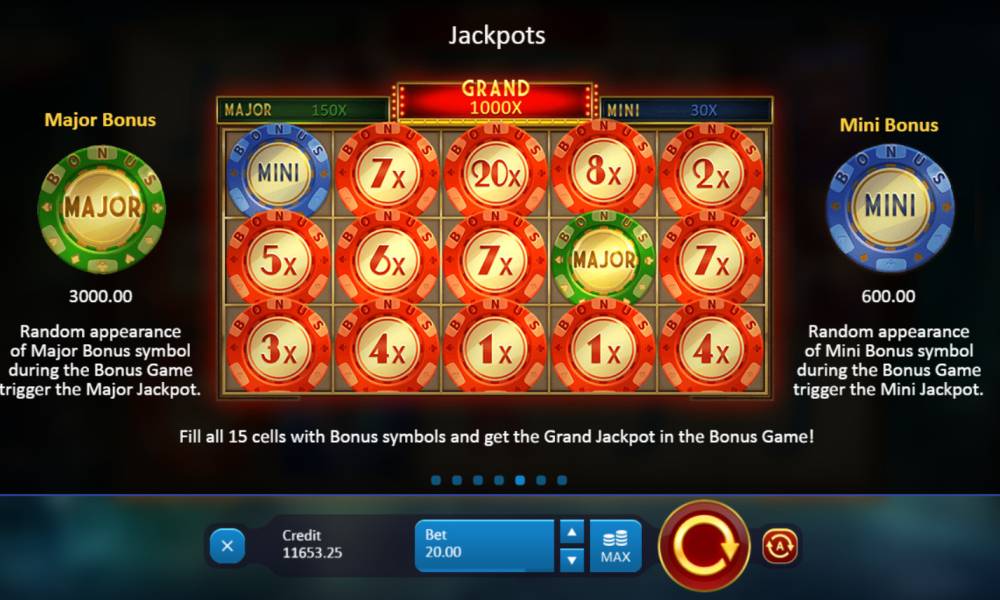 It is possible to win any of these prizes during the bonus feature. If a chip with Mini or Major sign appears at the screen, the player wins a proper jackpot. To win the maximal amount, all fifteen cells must be loaded by Bonus symbols.