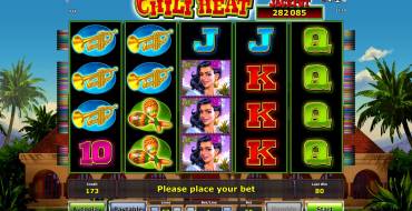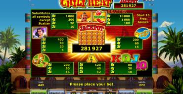 «Chili Heat» online video slot is a model with five reels, fifty active lines and twenty cells for symbols at the main screen. It is possible to play this slot by any active lines from available number. Please check out possible range of bets directly at online casino. Selection of gaming options includes eight ordinary icons, Wilds, Scatters, a gambling feature, free spins and a progressive jackpot. The basic symbols bring wins, forming combinations of same elements at active lines. All combinations must begin from the first left reel. As usually, only the most valuable chain at each line is taken in account. All possible combinations are provided with special indexes from x5 to x1000. They are multiplied by the bet per line. Scatters are paid by different rules. In the gambling feature you would have to move up the stairs. Payoff can be doubled with every step. However if the fortune turns its back on you, you lose whole current amount. Winning limit for one round is one thousand total bets per spin. RTP is 100% here.