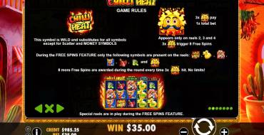 - Wild (a logo of «Chilli Heat») is a joker. It brings no payoffs on its own, but helps making combinations of other icons, except other special. Wild appears in stacks at the reels.