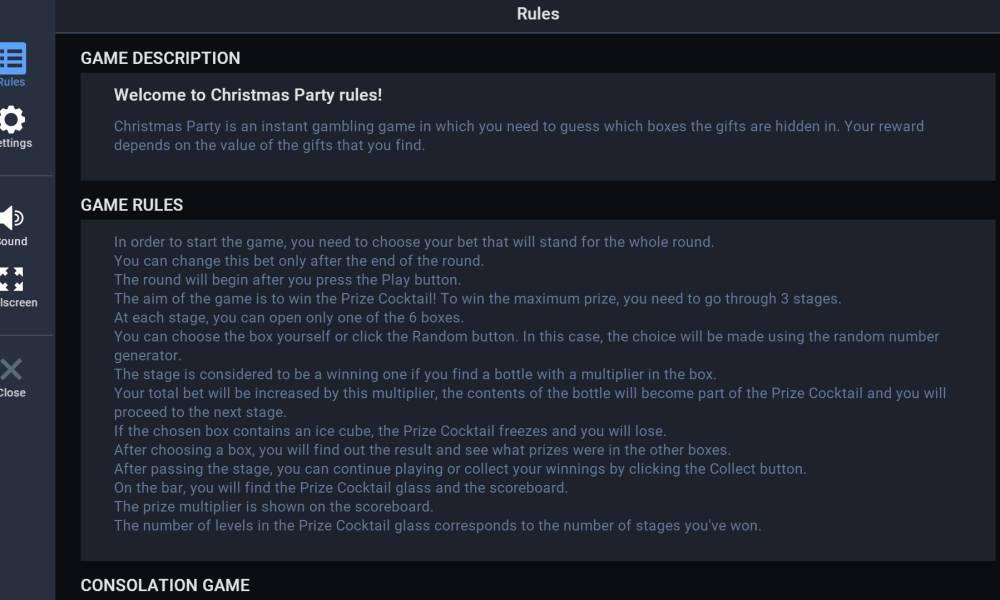 The Christmas Party pokie machine from provider EvoPlay has an extremely unconventional playing field and gameplay itself. In it, you will have to guess one of 6 boxes that hold a multiplier for the bet. Even if you fail, you can get back half of the bet with a 50% chance.