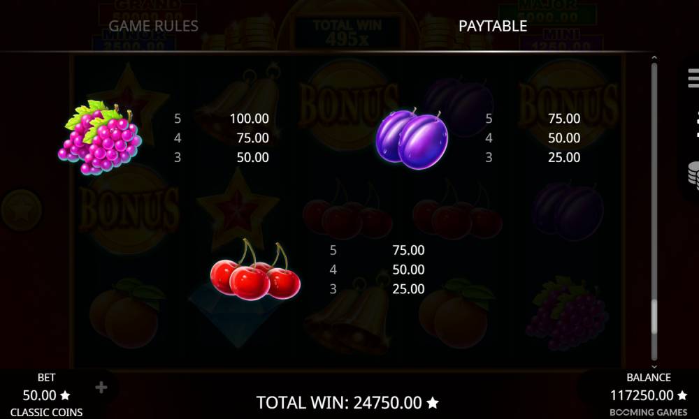 The pokie has a simple design with no distracting details or special effects. The field is separated from the background by a frame. If you click on any of the simple symbols on the field - will appear information with payouts for this sign. Above the field are the sizes of each of the jackpots. They change depending on the selected bet. To the left is a button to buy a bonus: a star on a round background. In the Cash Spins round, this is where the respins countdown is located. On the top right there are 3 buttons - menu with settings, information (about payouts and slot rules) and bet selection. Another block for bet selection is on the bottom left. The difference between them is that in one you can only increase or decrease the bet with the + and - buttons, and in the second you can see all the possible amounts and choose the right one. At the bottom right there is a large start button with an additional menu. It opens by clicking on the + to the left of the start button. Hidden in the additional menu are spin acceleration, autospin of 50 spins, maximum bet selection and sound on/off. Below the start button, the balance is shown. Under the field in the center will be shown the size of the payouts. In addition to the amount, the number of lines that paid (if there are several) is also highlighted. For gamblers who are going to play Classic Coins, I advise: