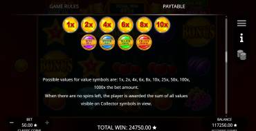 Cash Spins. Bonus game with respins, triggered when 3 Bonus symbols appear in the simple spins. A random number of Collector symbols from 1 to 3 appear on the middle reel. They remain on the field until the end of the round. Then 3 respins are triggered. For them on the remaining 4 reels can appear on the other 4 symbols Value. If at least 1 such sign falls out for 3 spins - its multiplier goes to each Collector symbol. For example, if there are 2 Collectors on the field, and 2 Value with multipliers x2 and x5, then both Collectors will accumulate x7, and the total winnings will be x14. If for 3 respin appeared at least 1 Value symbol - the gambler again gets 3 tries. Value symbols disappear after appearing. If no Value has appeared in 3 respins, the round ends and the multipliers accumulated in the Collector symbols are paid out.