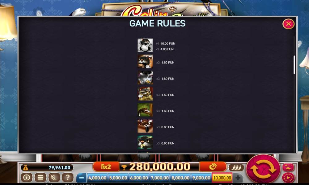 Colin the Cat pokie offers a standard playing field with five reels and three rows. The gameplay is based on 10 fixed paylines, which form combinations when the matching symbols from left to right (only in this sequence). To start the game you must choose a bet, which ranges from 0.2 to 10,000 coins per one rotation of the reels, which allows you to adapt the game to both beginners and experienced players.