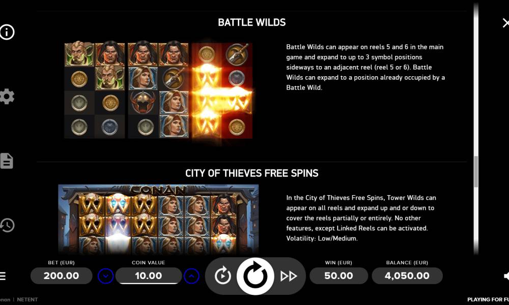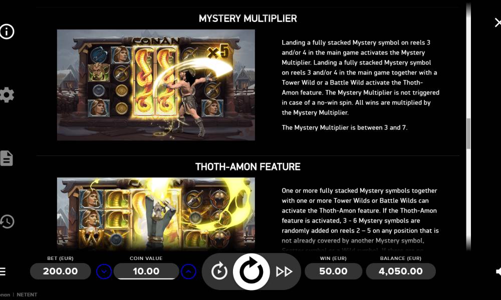 The Conan is available for free testing at Casinoz.club. All leading online casinos powered by NetEnt invite the gamblers to play this slot for real money.