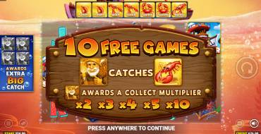 When 3, 4 or 5 Scatter symbols fall on the field, the player gets 10, 15 or 20 free spins. They are played on a standard set of reels. During the round, the usual and golden Wild symbols are active. They collect and pay out cash values from crustaceans. Each wild symbol that falls out on the field goes into a special scale. When four pieces are accumulated, the smaller crustaceans are swapped for the older ones. Five extra spins are also given. This feature is called Extra Big Catch.