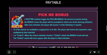 Pick Me Bonus. The round is activated when three Scatter symbols appear on the field. Two skeletons appear in front of the player. It is necessary to click on one of them and get the corresponding cash prize. Further, paired skeletons will also appear, under one hides a payout, under the other the word Collect. The game will go until the user points to the collection symbol. A maximum of 10 skeletons containing a cash payout can be presented in total. All collected prizes at the end of the round are totaled and multiplied by the bet that was in effect in the base spin.