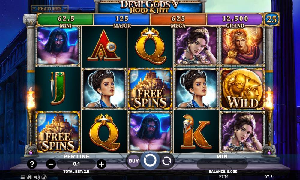 The Demi Gods V - Hold & Hit is a pokie with 5 reels, 3 cells high. On this field are played 3 special and 8 regular symbols. For making combinations are responsible for 25 fixed lines, taking into account from left to right. For the minimum win requires 3 identical signs on one of the paid directions. Bonuses provede free spins with a huge symbol and respins with jackpots. Multipliers are available exclusively during the free spins, when the Scatter symbol falls on the center reel. The bet is set by the player, choosing from a ready-made range from 0.25 to 250.
