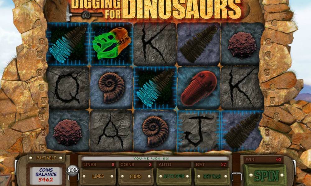 Digging for Dinosaurs is a five reel free online slot machine, which is available for playing in range from one to nine pay lines. It is also provided with the standard icons, the special symbols and a round of prize spins with advanced options.