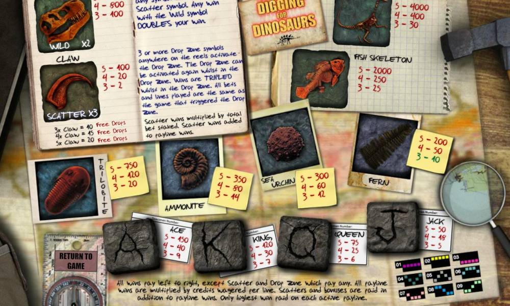 The payment table is small - it consists just of one page. All the necessary information about the indexes, location of the active lines and the main rules can be found there. Most of online casinos provide an opportunity to download Digging for Dinosaurs slot machine or launch it in a flash mode right at the website of an online casino.