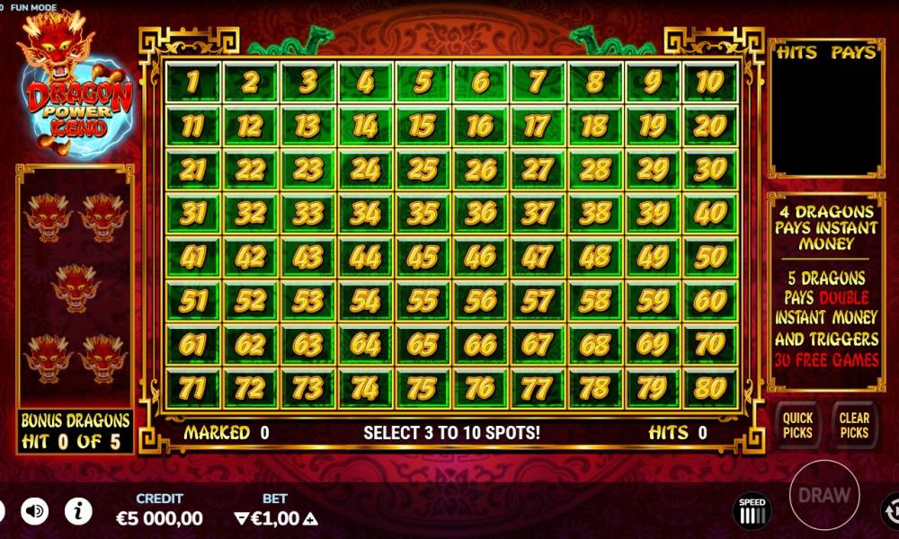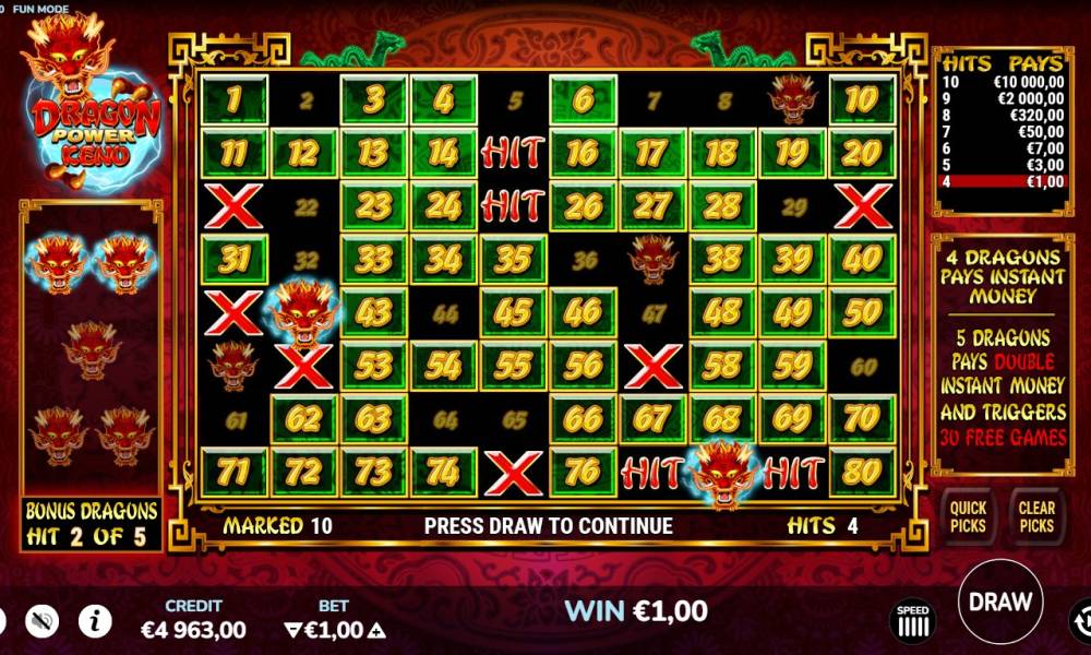 Dragon Power Keno pokie machine from provider Atomic Pokie Lab will appeal to fans of betting without complications. The slot works simply - put on a few numbers and wait to see if you are lucky to guess. If yes, the machine generously rewards the user. Such ease beckons and entices, but it is worth remembering that the risks of losing are great. Therefore, the online slot is suitable for those who are willing to invest in it and spend time. Patience is rewarded in a big way, up to x20000 of the bet. Several additional features and bonuses add excitement and make the machine not boring, but intriguing.