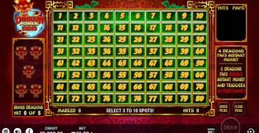 The Dragon Power Keno pokie machine has no reels, there is just a 10x8 field consisting of 80 cells. The essence of the game is to bet on several numbers and see if it played. You can bet from 3 to 10 variations and then run the game. The slot will show 20 random numbers. The payout is different depending on how many bets were placed and how many of them played. For example, when selecting ten numbers, the table is as follows: