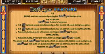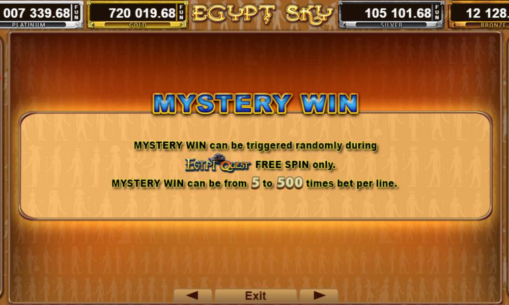 Mystery Win. At a random moment during the Egypt Quest Feature round, the user can win a big prize. It is random - from x5 to x500 of the bet. The reward is paid out immediately to the player regardless of the course of the round.