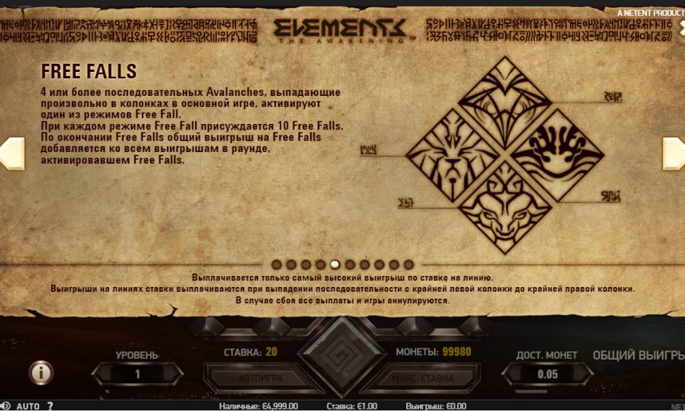 Elements: The Awakening has five reels and twenty constantly active lines. Play the pokie machine can be at a rate of one to ten coins. Their nominal value is determined by the user himself in the range from one to fifty cents.