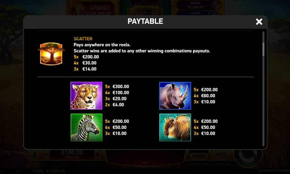 Before you start playing, check it for volatility. Fortunately, Elephant Stampede has a medium volatility, making it an ideal choice for all players with an above average bankroll.
