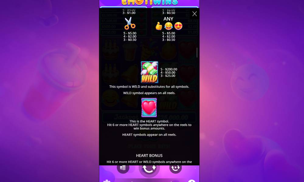 The rules and interface of the pokie can be studied without registration, using demo mode. It is easy to run it both in the casino, where Emotiwins is presented, and on this page. In demo mode, the player receives a virtual balance, which allows you to test the game for free and familiarize yourself with its functionality.